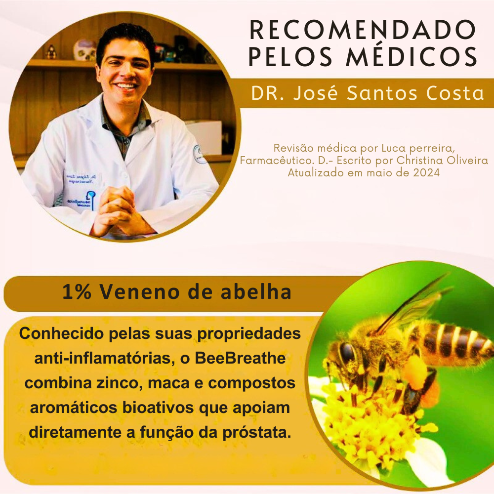 Aprovado pelo Dr. José Santos Costa do Instituto da Próstata, o BeeBreathe™ demonstrou alta eficácia no apoio à saúde prostática. Contém 1% de veneno de abelha, zinco e compostos bioativos que reduzem a inflamação e melhoram a função da próstata.
